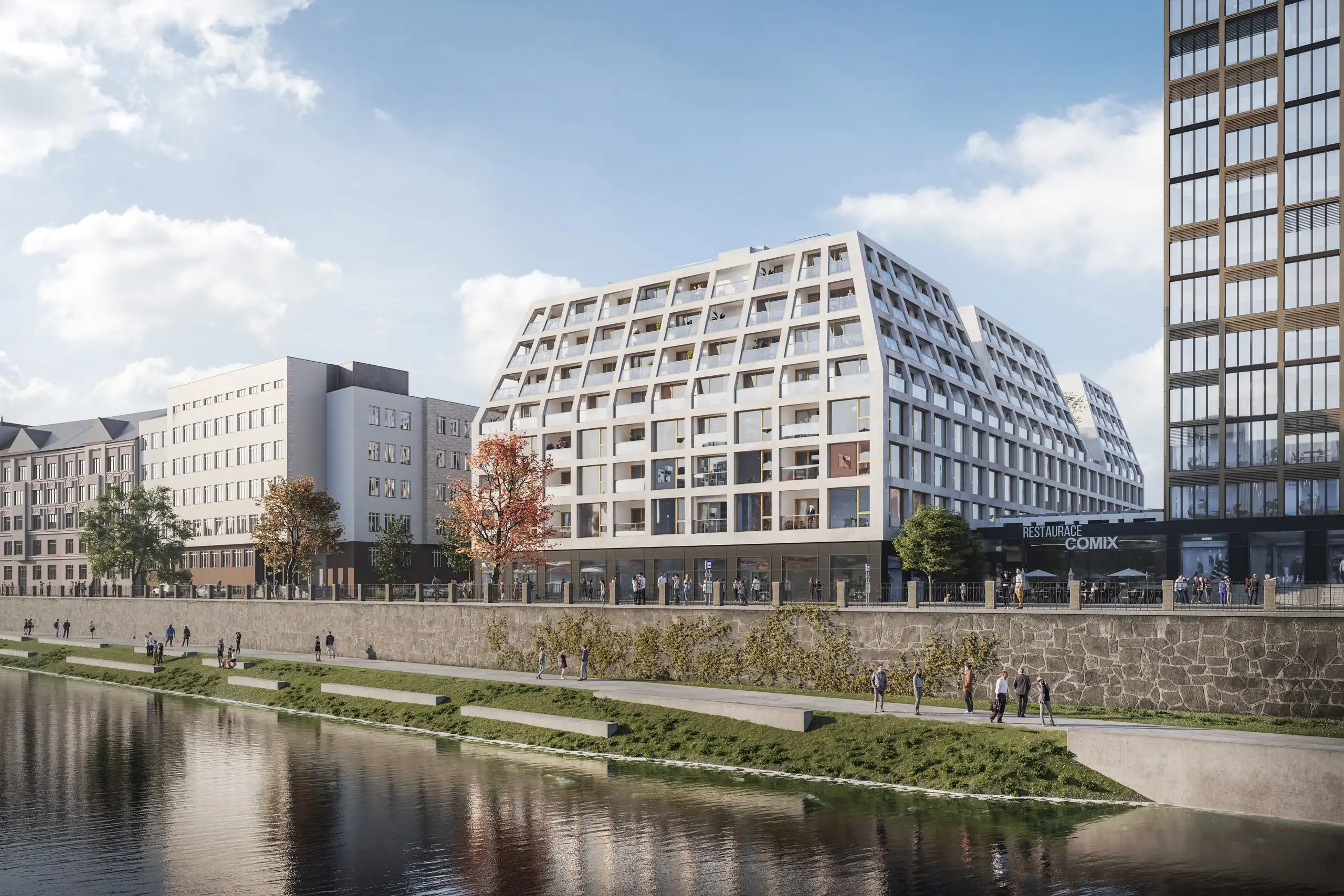 The English Embankment Palace is growing in the very heart of Plzeň's historic city center, where new construction is an exceptionally rare phenomenon. Just a few steps from Republic Square with the Cathedral of St. Bartholomew and surrounded by Plzeň's most beautiful parks and the popular Radbuza River embankment.